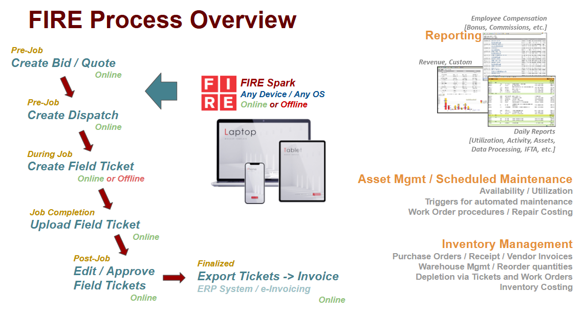 FIRE reduces the amount of work you and your employees perform to invoice clients, produce reports, pay employees, track assets and operational information, and generally run your business.